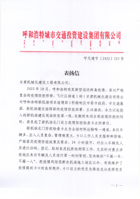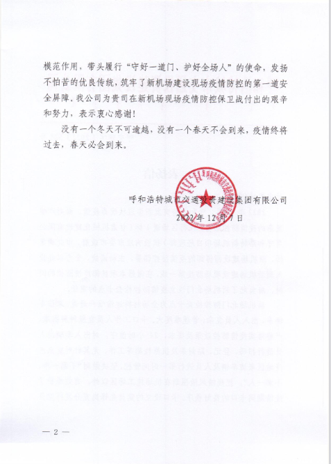 2022年12月7日,呼和浩特市交通投資建設(shè)集團有限公司給我司發(fā)來表揚信,表揚信中充分肯定了我司呼和浩特新機場項目部在疫情防控工作上作出的努力,展現(xiàn)了我司的社會責任與擔當。