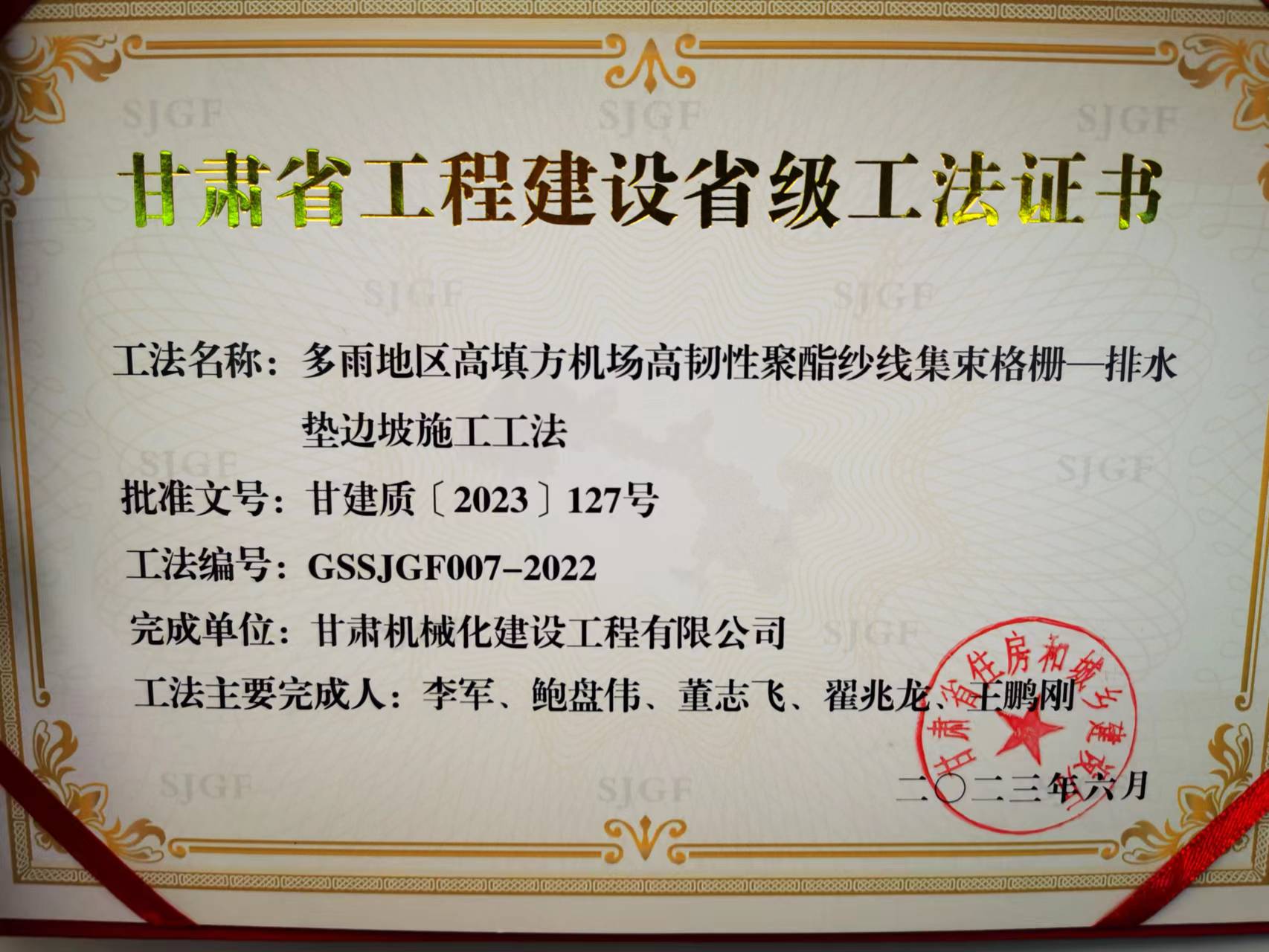 近日,甘肅省住房和城鄉(xiāng)建設(shè)廳頒發(fā)省級工法證書,我司獲得省級工法榮譽(yù)。