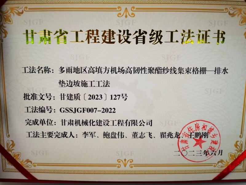 近年來,我司不斷加強(qiáng)技術(shù)創(chuàng)新和精品工程創(chuàng)建,科技創(chuàng)新能力和工藝水平再上新臺階。在承建的麗水機(jī)場土石方工程02標(biāo)段中,面對多雨地區(qū)高填方施工中的重難點,公司專門組建了科研和施工小組,通過大量現(xiàn)場工藝實踐、工藝改善,提煉出項目重難點的關(guān)鍵技術(shù)。2023年6月,獲得了“多雨地區(qū)高填方機(jī)場高韌性聚酯紗線集束格柵—排水墊邊坡施工工法”。