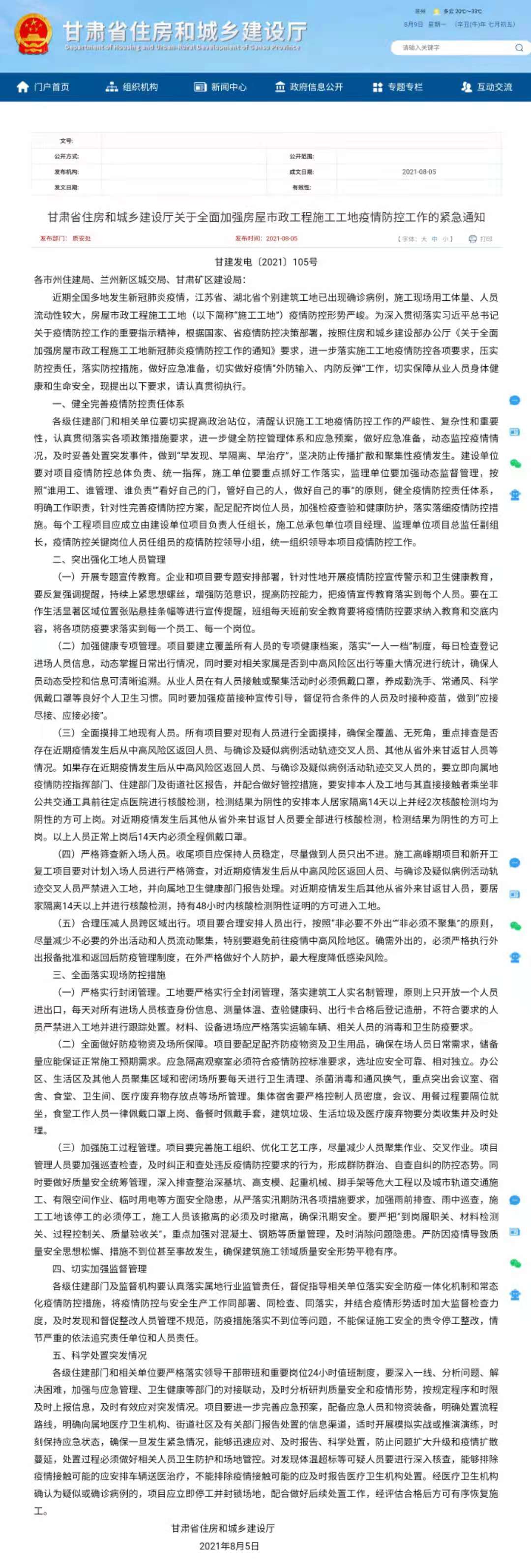 為深入貫徹落實習近平總書記關于疫情防控工作的重要指示精神,根據(jù)國家、省疫情防控決策部署,按照住房和城鄉(xiāng)建設部辦公廳《關于全面加強房屋市政工程施工工地新冠肺炎疫情防控工作的通知》要求,確保安全生產(chǎn)和正常施工生產(chǎn)秩序,現(xiàn)將《甘肅省住房和城鄉(xiāng)建設廳關于全面加強房屋市政工程施工工地疫情防控工作的緊急通知》轉(zhuǎn)發(fā)給你們,請各單位遵照執(zhí)行。